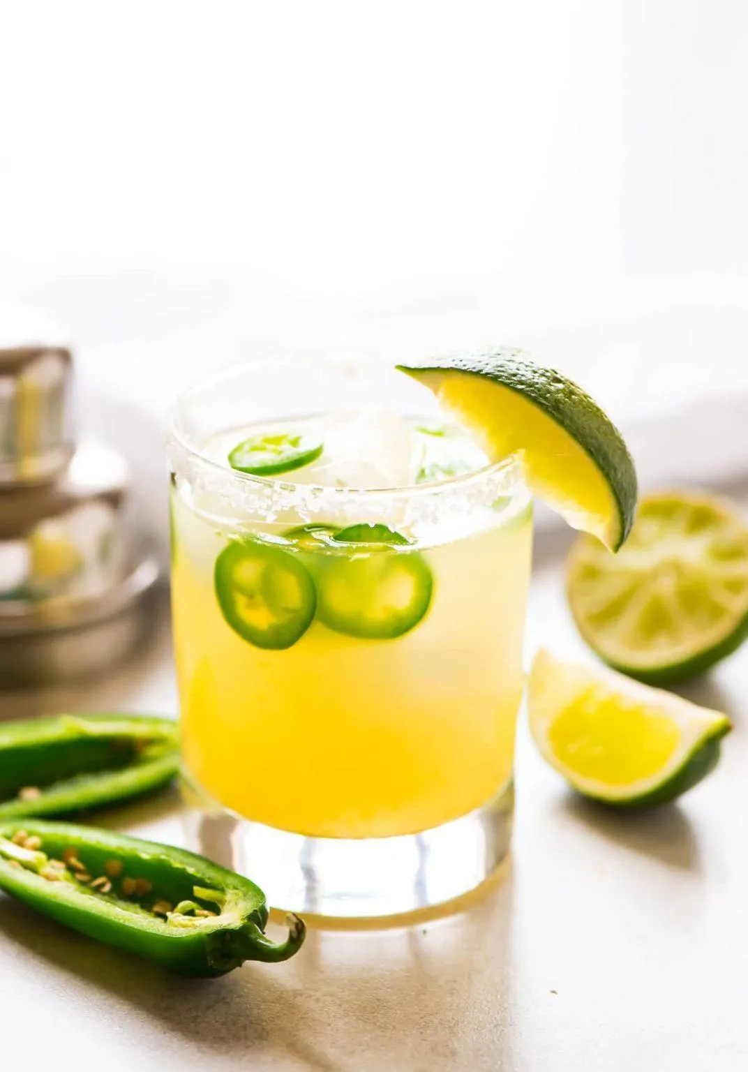 Garnish with an extra slice of jalapeño, salt and lime.